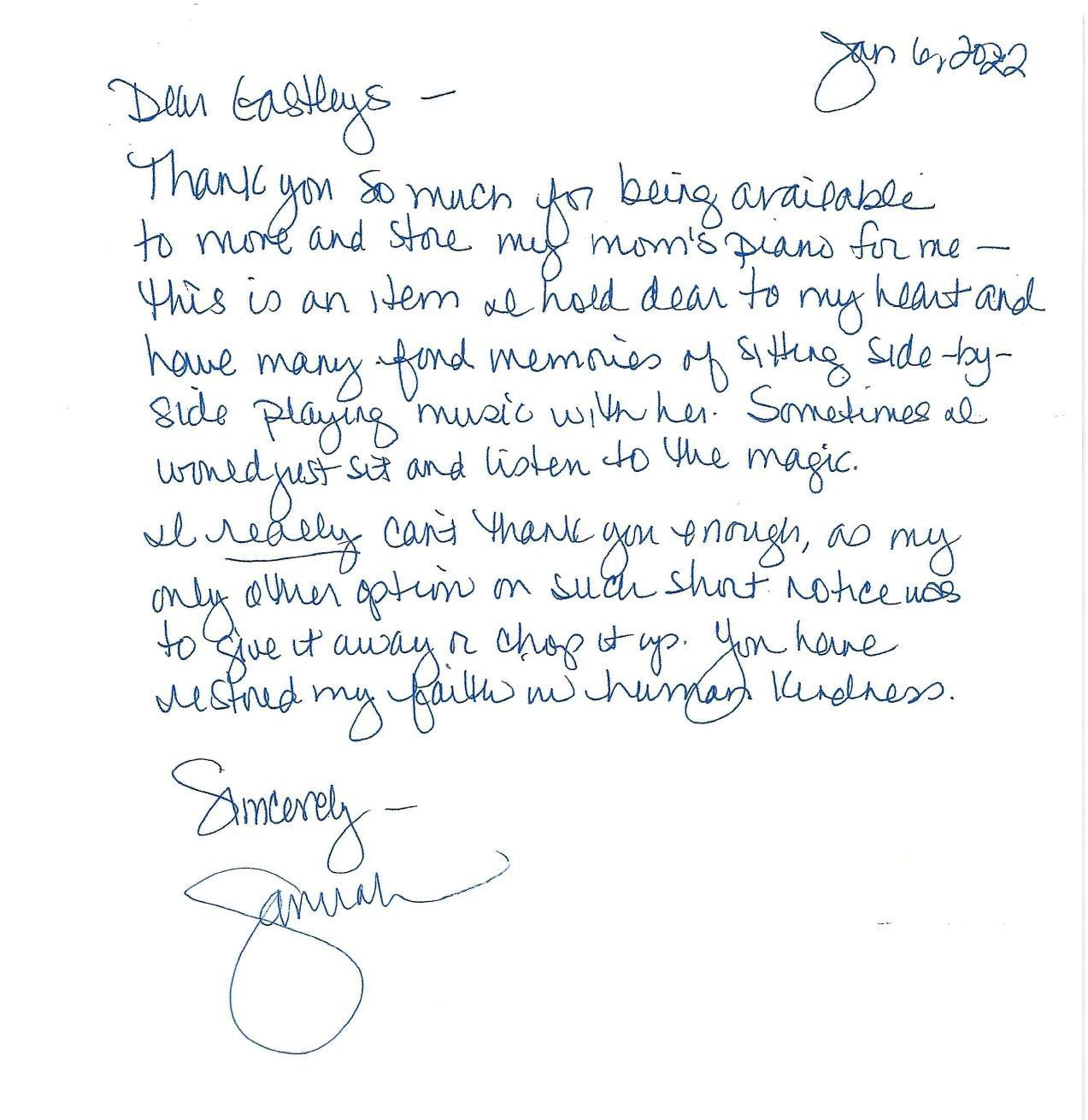 “On time on both ends, experienced, polite and professional crew, careful with my furniture, clean equipment, respectful of COVID situation. This is my third time with Gastley and there will be more as the need arises. Thanks again.”