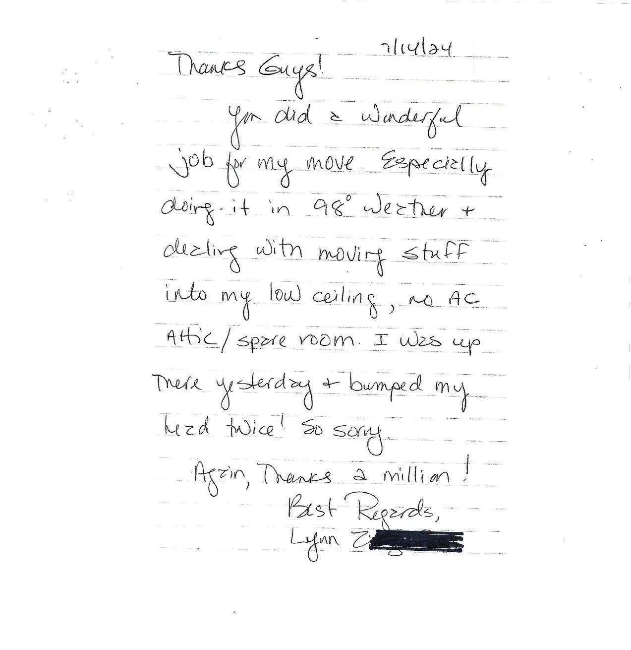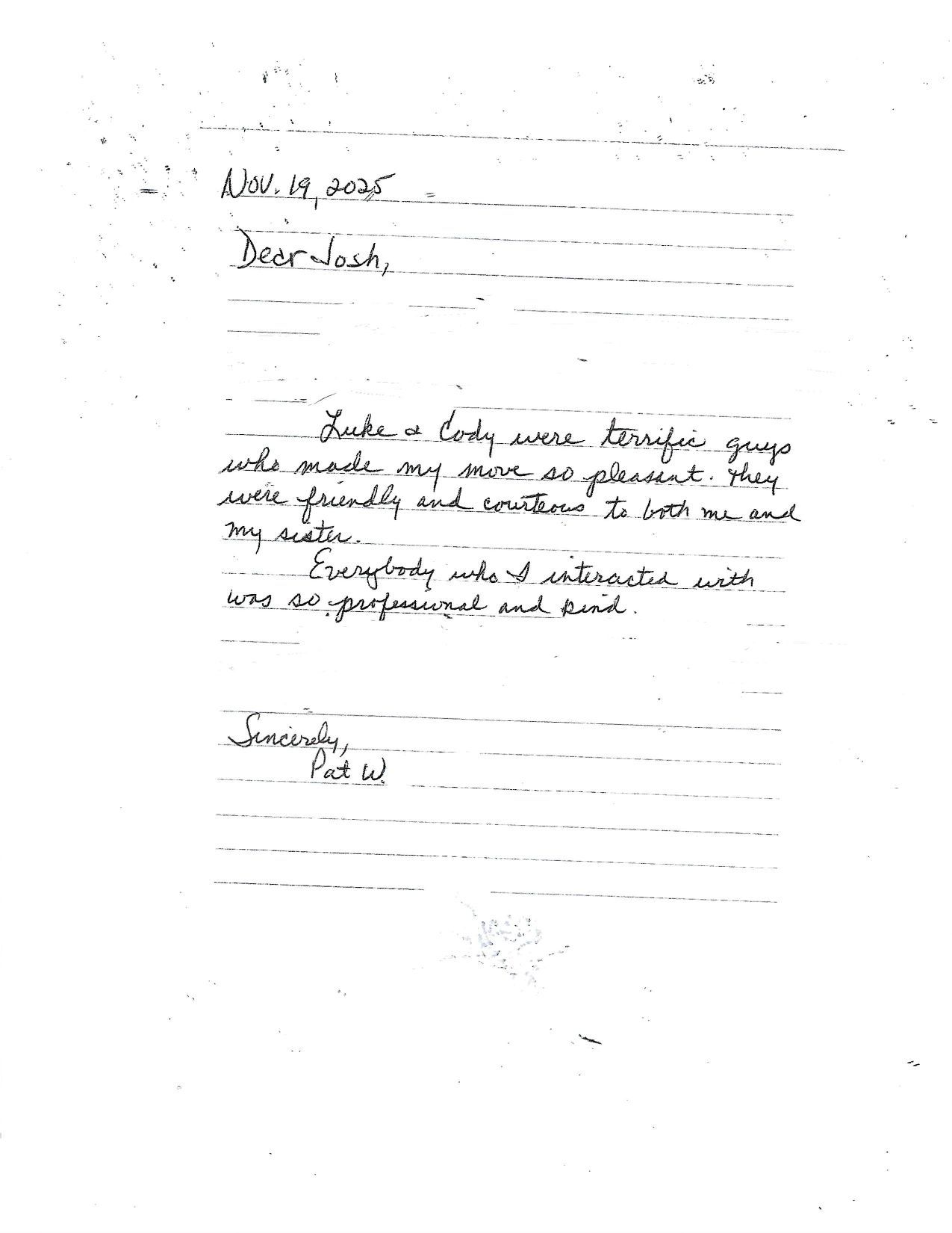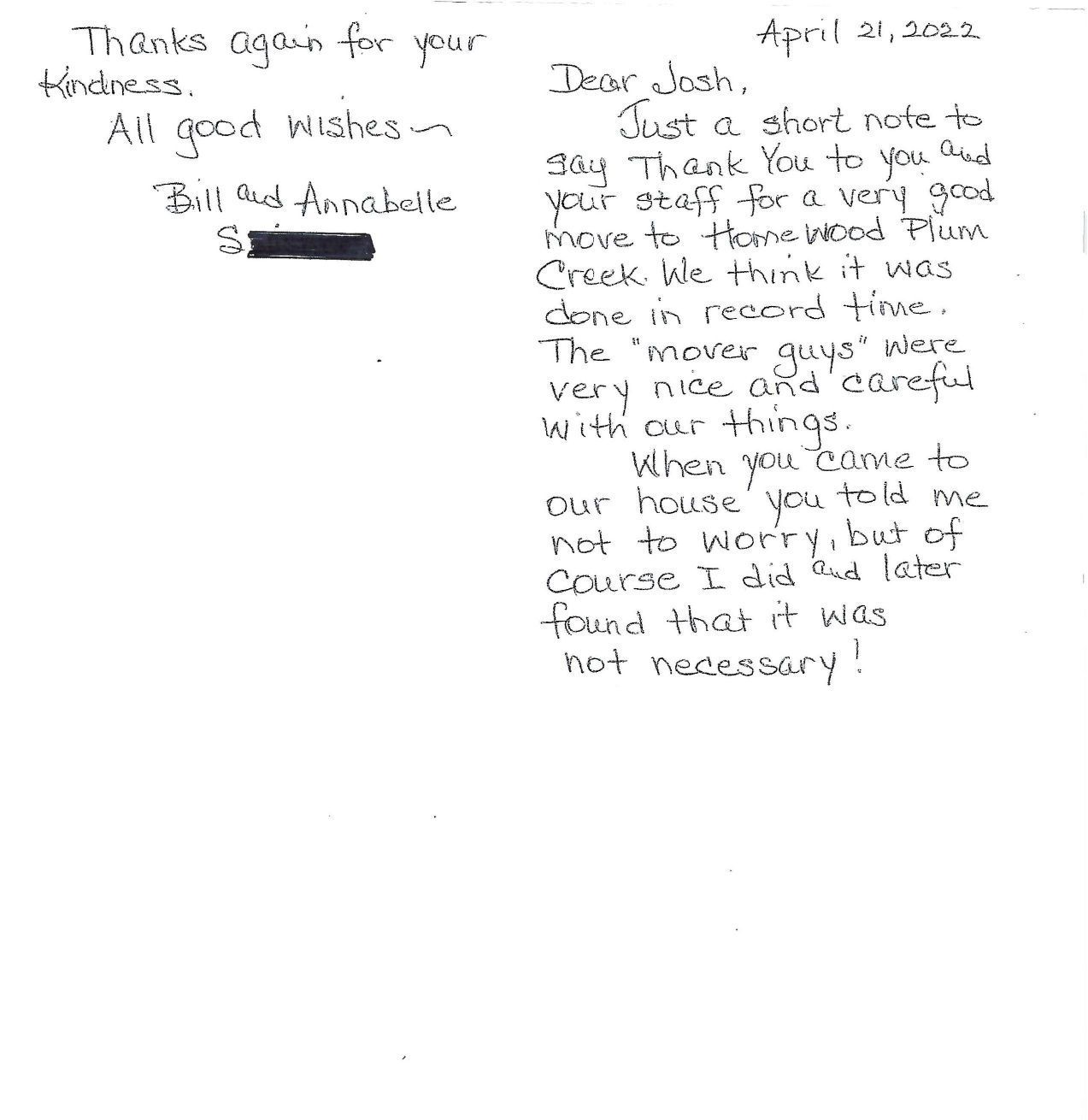 “Good morning Josh and Celia. I wanted to say thank you for the move on 11-20. Travis, Hunter, Brandon, and Seth all did a great job! Happy Thanksgiving!”