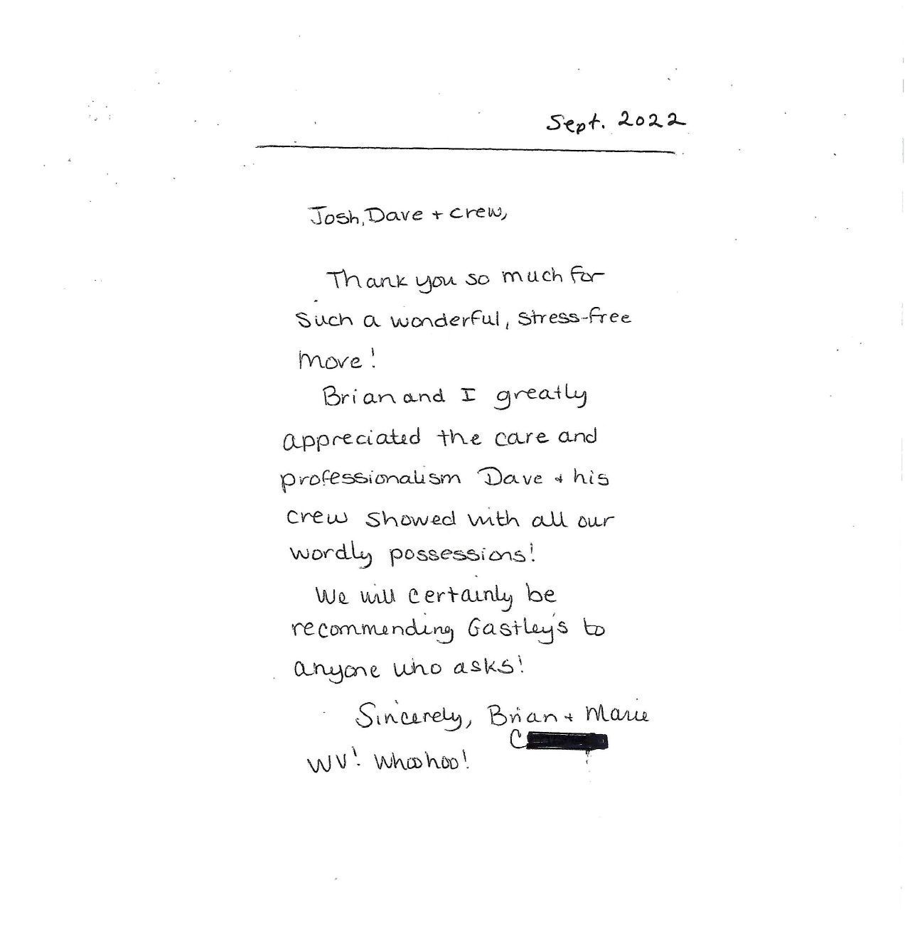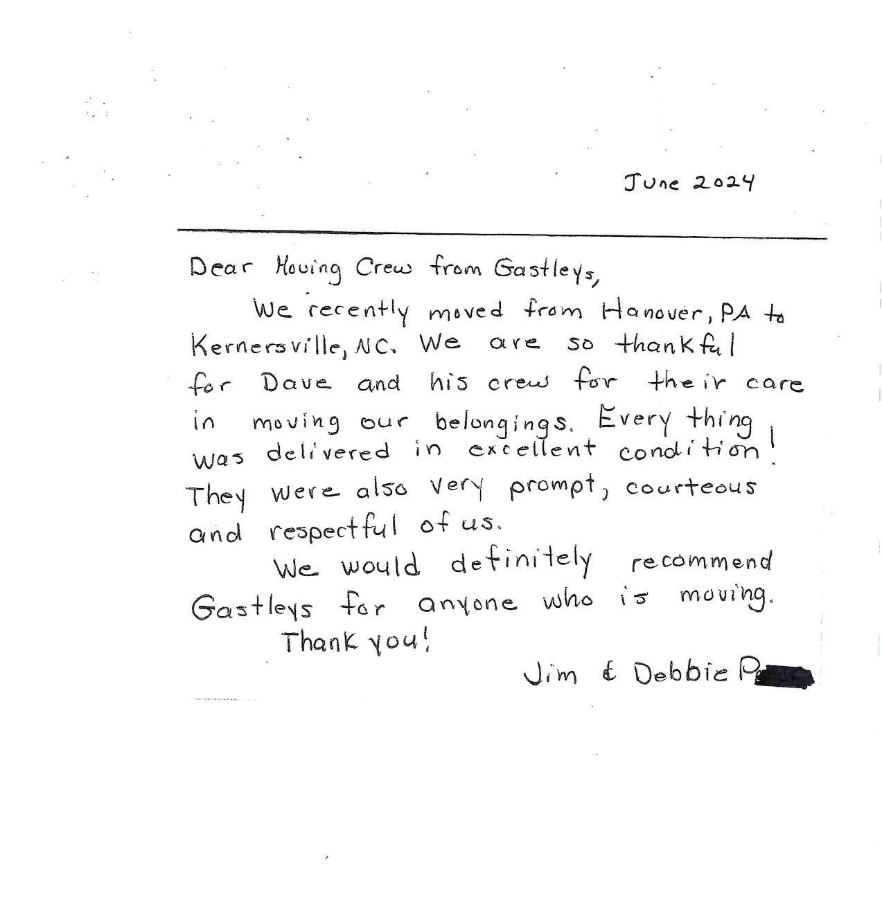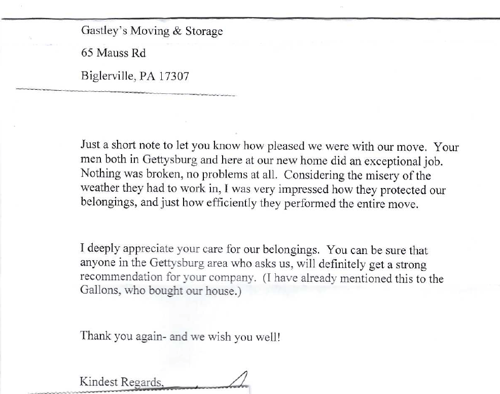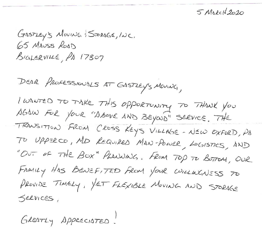 “I recently used Gastley's for my move from Waynesboro to Gettysburg and I can honestly say it was the best moving experience I've ever had. The four-man crew (Travis, Seth, Gabe, and Cody) were all very friendly, professional, polite, hard-working, and obviously knew what they were doing and handled everything efficiently but with great care. Thank you so much for making that part of the move so easy and smooth.”