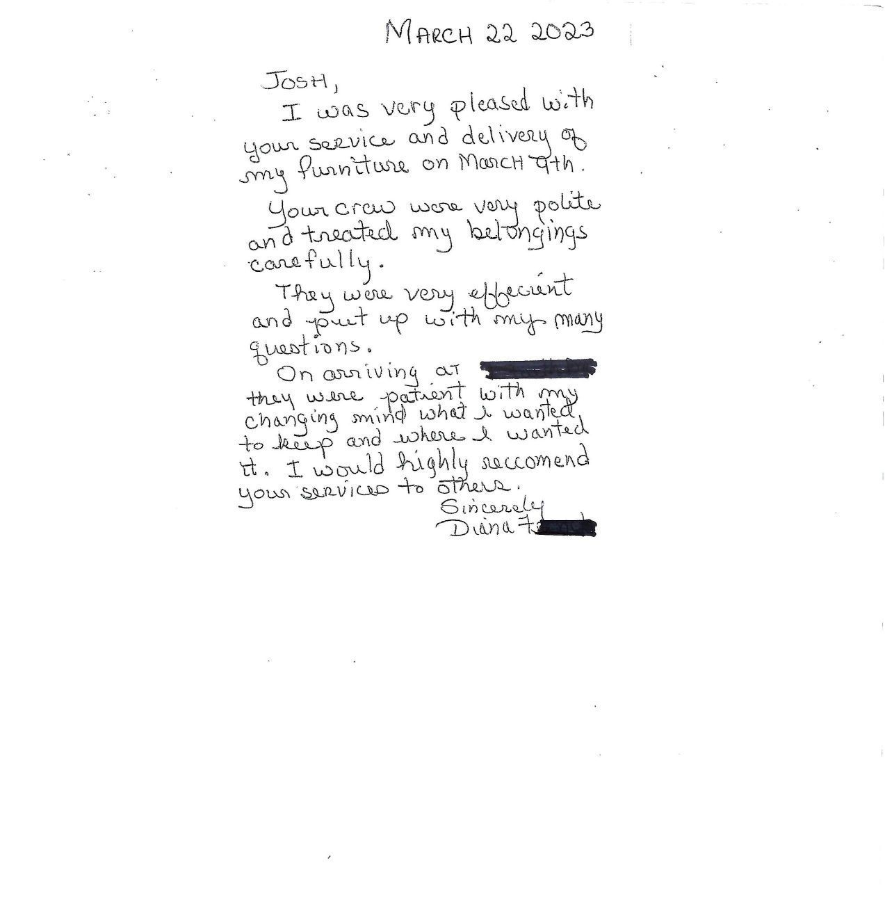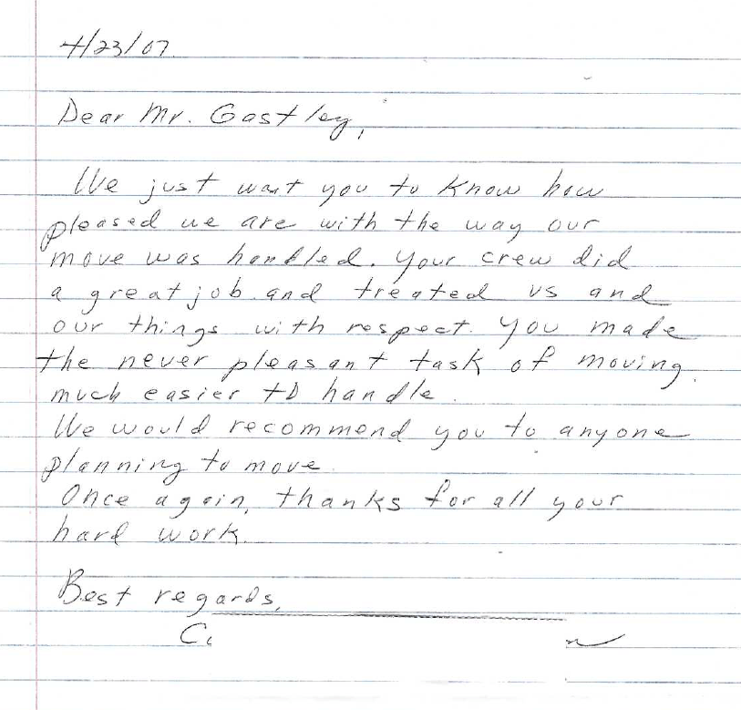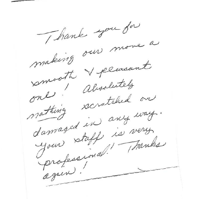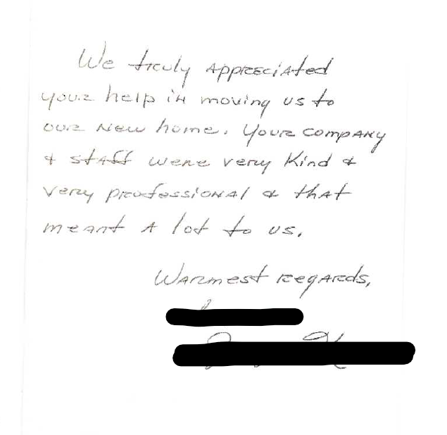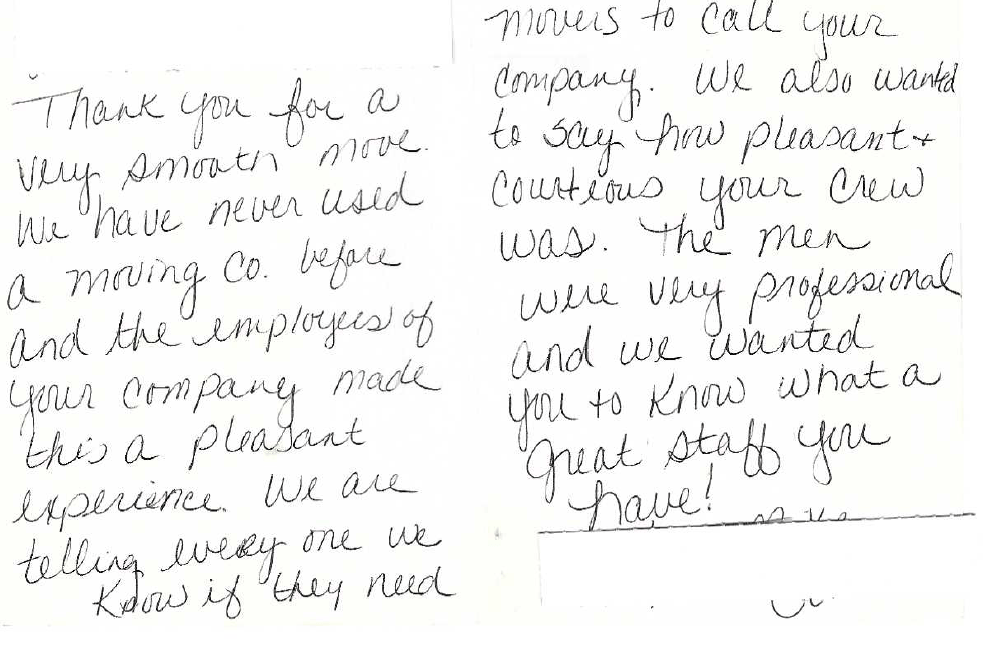 I can honestly say that we would recommend your company to help anyone move (except people we don't care for). We told the person at closing how much we enjoyed your folks, and what a wonderful job you and your folks did and she wanted your name and info so I provided it to her. (sorry I don't remember her name, but we did tell her to call you for all her moving needs and she was very interested).