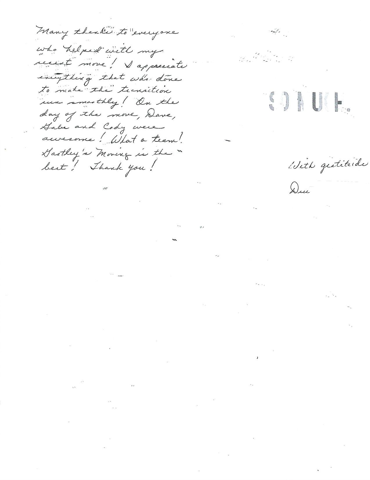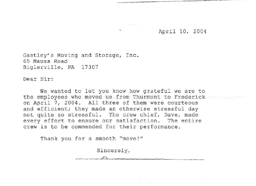 GASTLEY'S MOVING AND STORAGE INC TESTIMONIALS